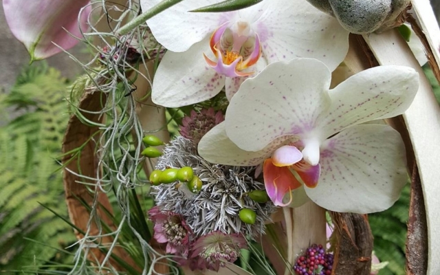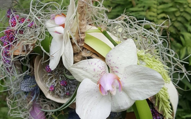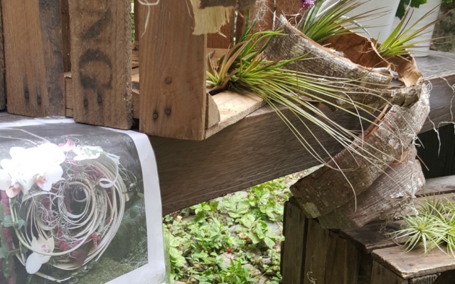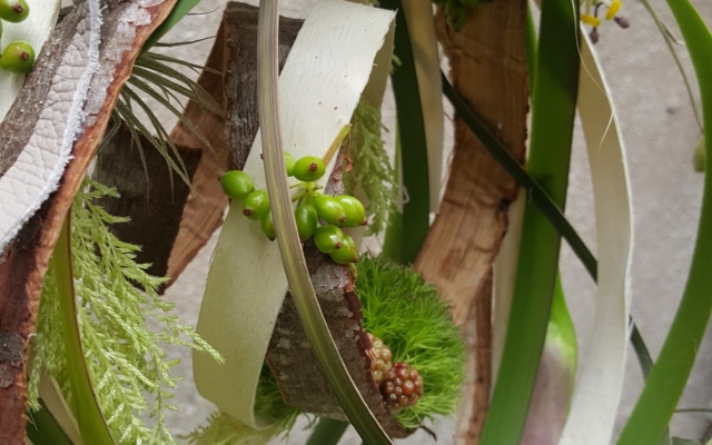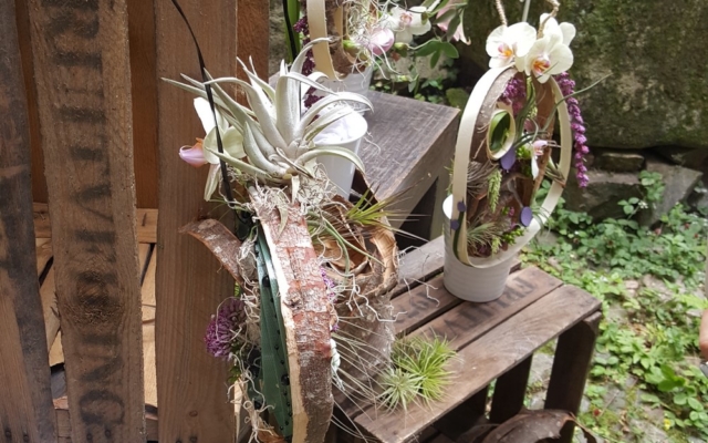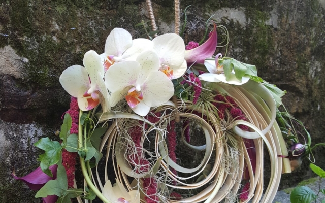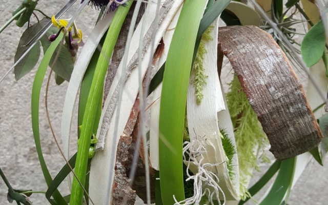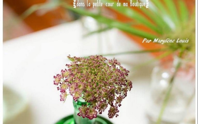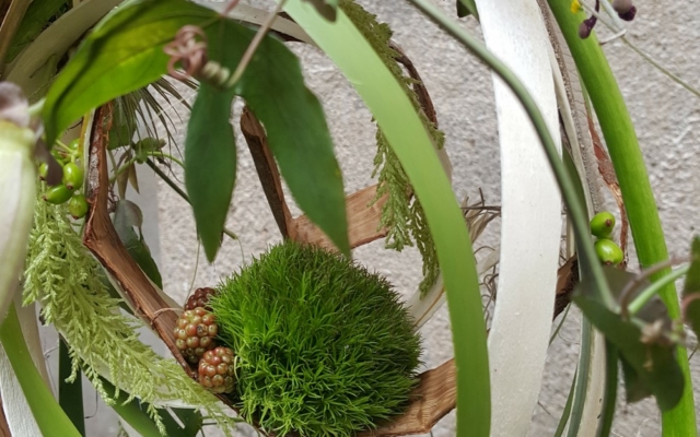 En juin l’idée était de proposer une spirale fleurie. Cette spirale évoque l’équilibre dans le déséquilibre, ou l’ordre dans le changement. Nous étions une fois de plus au complet le 24 juin 2017, dans la petite cour de ma boutique.